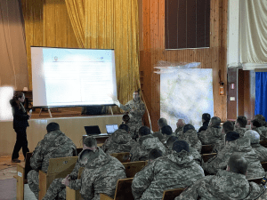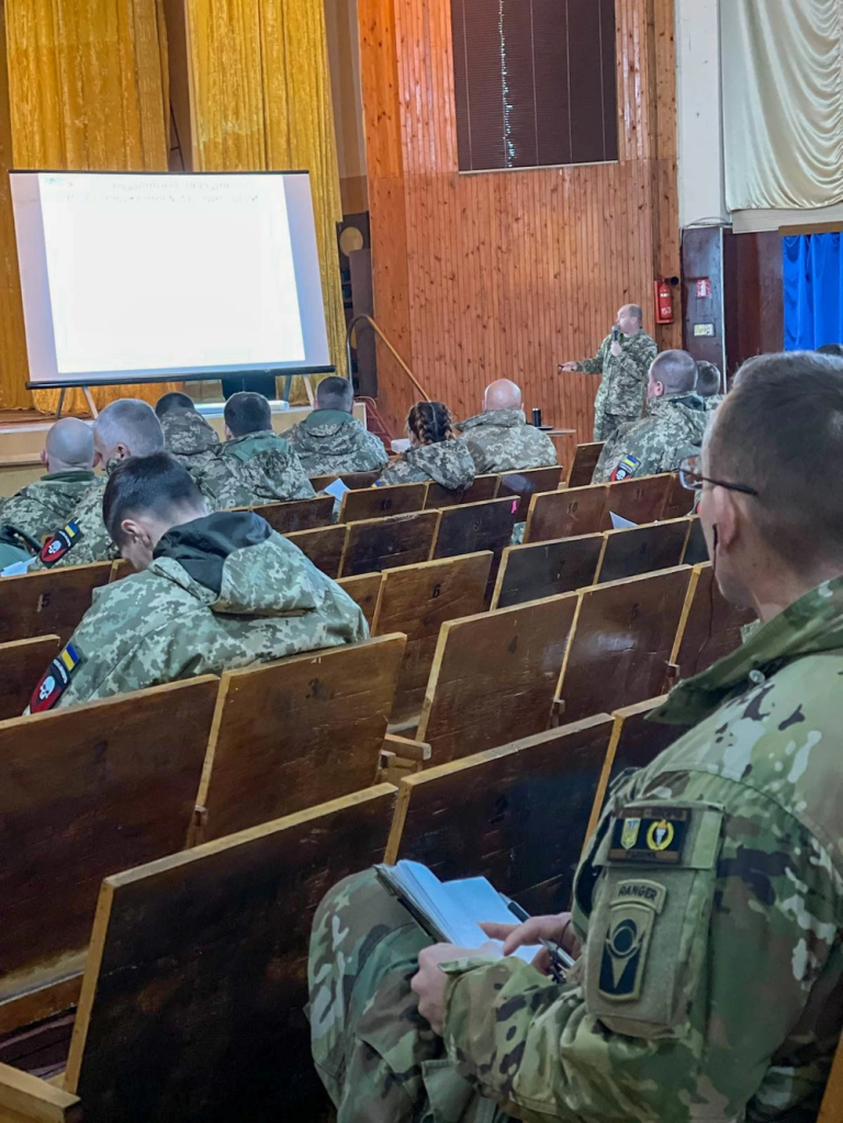 The article reads, “Joint Multinational Training Group – Ukraine’s CPT Tad Schnaufer, a Brigade Training Group mentor, listens to a block of Military Decision Making Process class instruction led by one of the senior Ukrainian Observer Controller/Trainer from the International Peacekeeping and Security Center Wednesday, Jan 12, 2022. Both JMTG-U advisors and Ukrainian OCTs formed a mobile training team to offer the class at the headquarters of the Ukrainian Armed Forces’ 72nd Mechanized Infantry Brigade…”