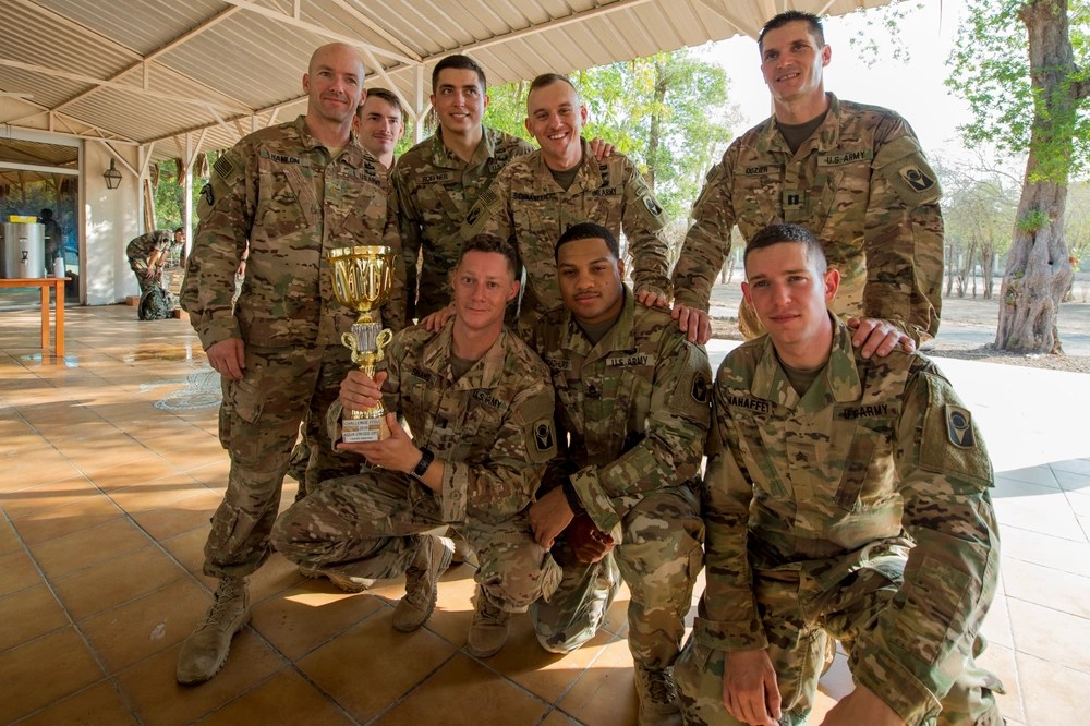 “Members of the Task Force Hurricane 1-124 Infantry Regiment pose with their trophy after placing first amongst all international participants for the French 5K Tough Mudder at a French military base in Djibouti, November 6, 2016.”
